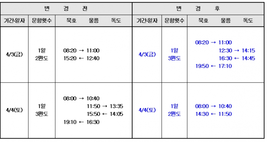 ■.2026년 04월03일 (금요일) 서울.경기.인천↔동해시(묵호항) 여객터미널 배차정보 동해시(묵호항) 여객선 출항 시간 여객선명:(씨스타1호):정원:442명 ■.묵호출항(08:20분)→울릉(도동):(씨스타1호) ■.울릉출항(도동) (17:10분) → 묵호:(씨스타1호) (제1호차) ■.영등포신세계백화점정문 새벽:03:00 ■.서울시청역 2번출구 새벽:03:30 ■.잠실역4번출구 직진 100미터 롯데마트정문앞 새벽:04:00 상기지역외 셔틀버스 미운행 (예약손님없음) 입니다 버스탑승시에는 두레고속관광 버스 를 찾으신후 예약자대표자이름 .인원수 말씀후 승차하세요 ■.셔틀버스 (묵호항여객선터미널):최소출발인원 확정안내 서울출발 :영등포(2명).서울시청역(2명).잠실역(2명):출발확정 경기권 :(안양(10명).수원(10명):출발인원:출발확정 인천지역 :(송내역(8명).부평역(8명):출발인원:출발확정