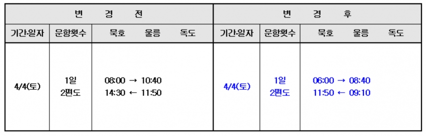 ■.2026년 04월04일 (토요일) 서울.경기.인천↔동해시(묵호항) 여객터미널 배차정보 동해시(묵호항) 여객선 출항 시간 여객선명:(씨스타1호):정원:442명 ■.묵호출항(06:00분)→울릉(도동):(씨스타1호) ■.울릉출항(도동) (09:10분) → 묵호:(씨스타1호) (제1호차) ■.영등포신세계백화점정문 새벽:00:30 ■.서울시청역 2번출구 새벽:01:00 ■.잠실역4번출구 직진 100미터 롯데마트정문앞 새벽:01:30 상기지역외 셔틀버스 미운행 (예약손님없음) 입니다 버스탑승시에는 두레고속관광 버스 를 찾으신후 예약자대표자이름 .인원수 말씀후 승차하세요 ■.셔틀버스 (묵호항여객선터미널):최소출발인원 확정안내 서울출발 :영등포(2명).서울시청역(2명).잠실역(2명):출발확정 경기권 :(안양(10명).수원(10명):출발인원:출발확정 인천지역 :(송내역(8명).부평역(8명):출발인원:출발확정